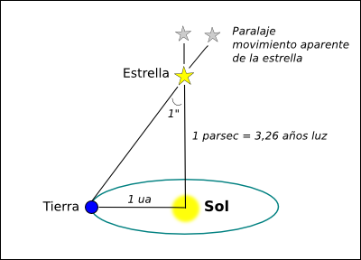 Un parsec es la distancia desde la cual el radio medio de la órbita terrestre se observa con un angulo de paralelaje de un segundo. Un parsec equivale a 3.26 años luz.